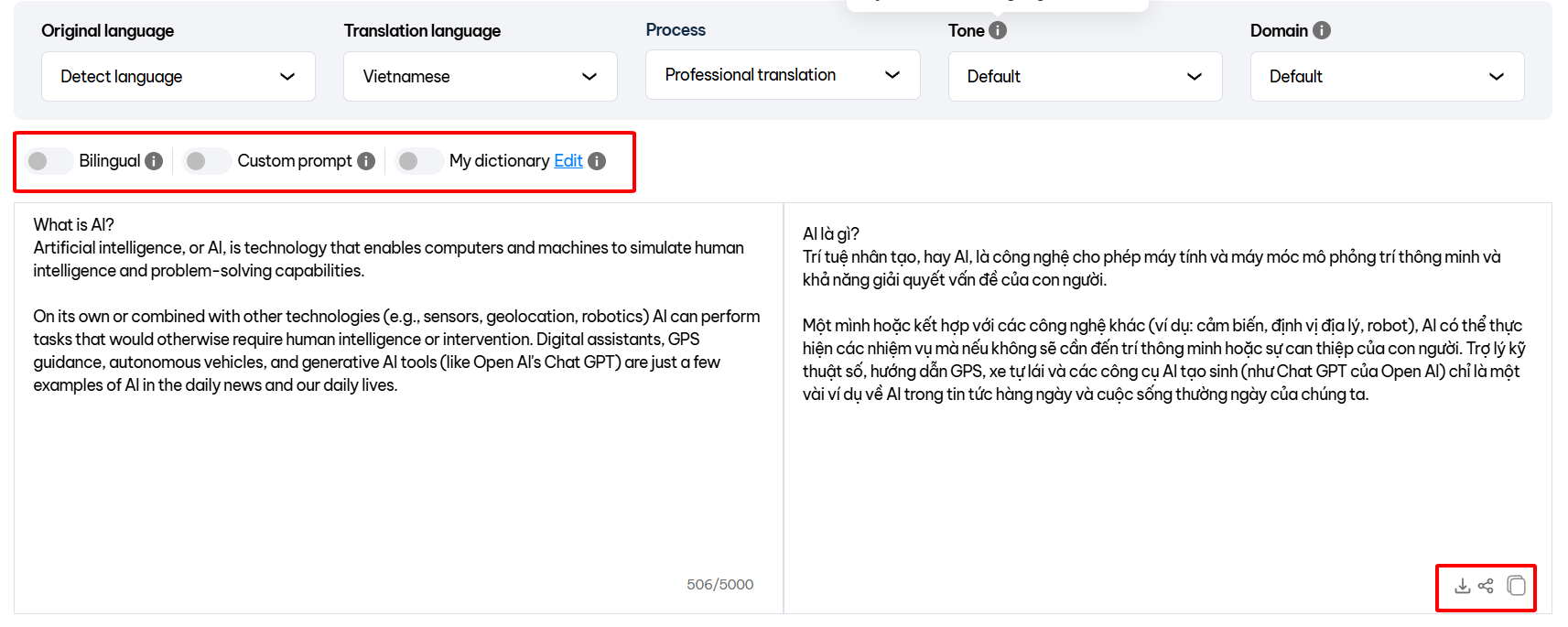 With the Text translation feature, you can copy and paste up to 5000 words into the textbox, and Doctranslate will provide you with the translation.