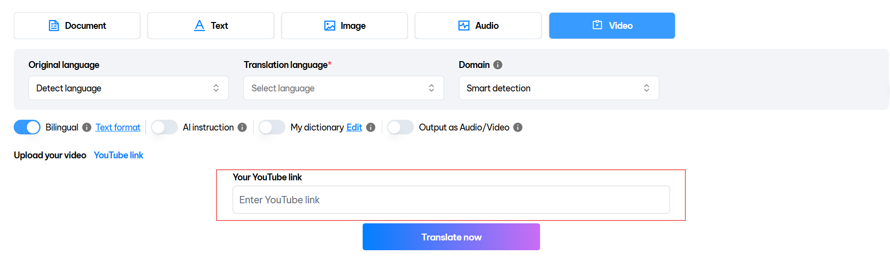 **Step 3:** Select and customize the **"Domain", "Bilingual", "AI instruction", "My dictionary", "Output as Audio/Video"** options for video translation.&#x20;