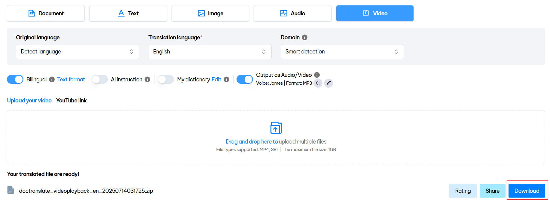 ***Note:** You can go to the **Translation History** page to download the translated video file.*