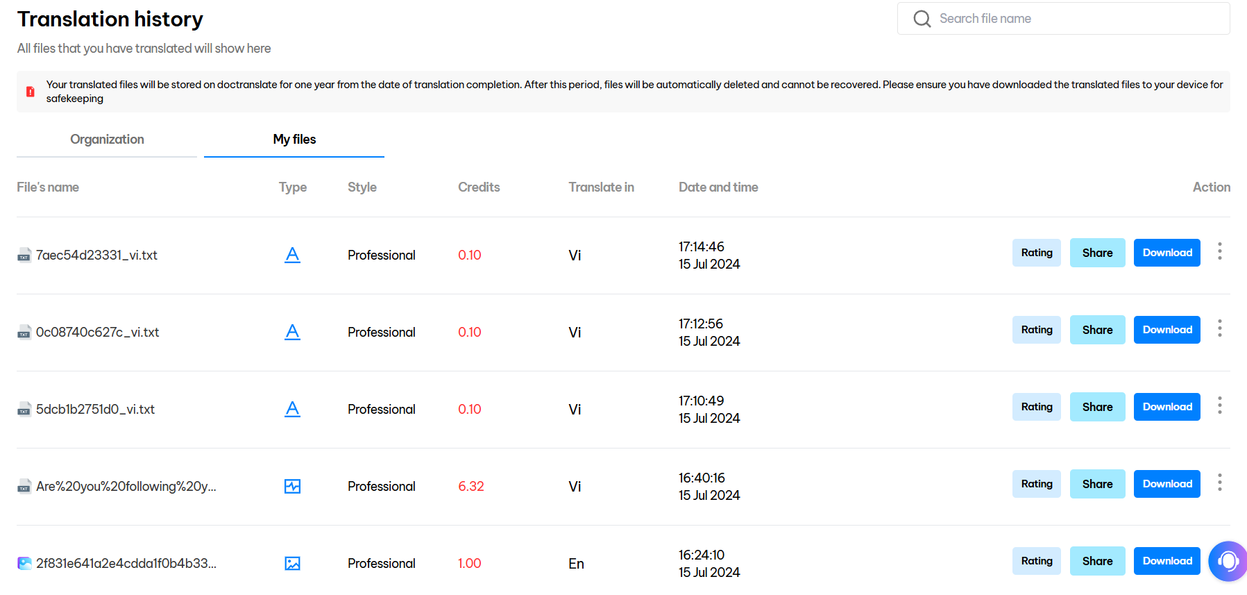 The translation history contains all the documents you have translated on the Doctranslate.io platform (including documents, images, and audio). You can access your translation history to review successful translations, check the number of credits used for each specific translation, and view the target language selected. You can also download translated files from here.&#x20;