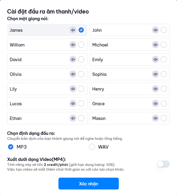 *\*Xuất file âm thanh/video:* Có thể tùy chỉnh giọng nói, định dạng đầu ra cho âm thanh/video
