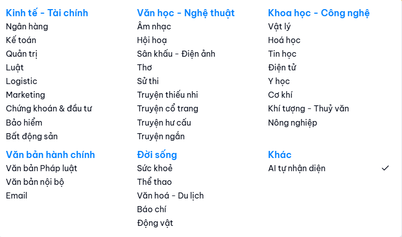 Mục này cho phép bạn lựa chọn lĩnh vực hoặc chuyên ngành của văn bản bạn cần dịch. Lựa chọn đúng lĩnh vực sẽ giúp ứng dụng hiểu rõ ngữ cảnh và sử dụng từ vựng phù hợp.&#x20;